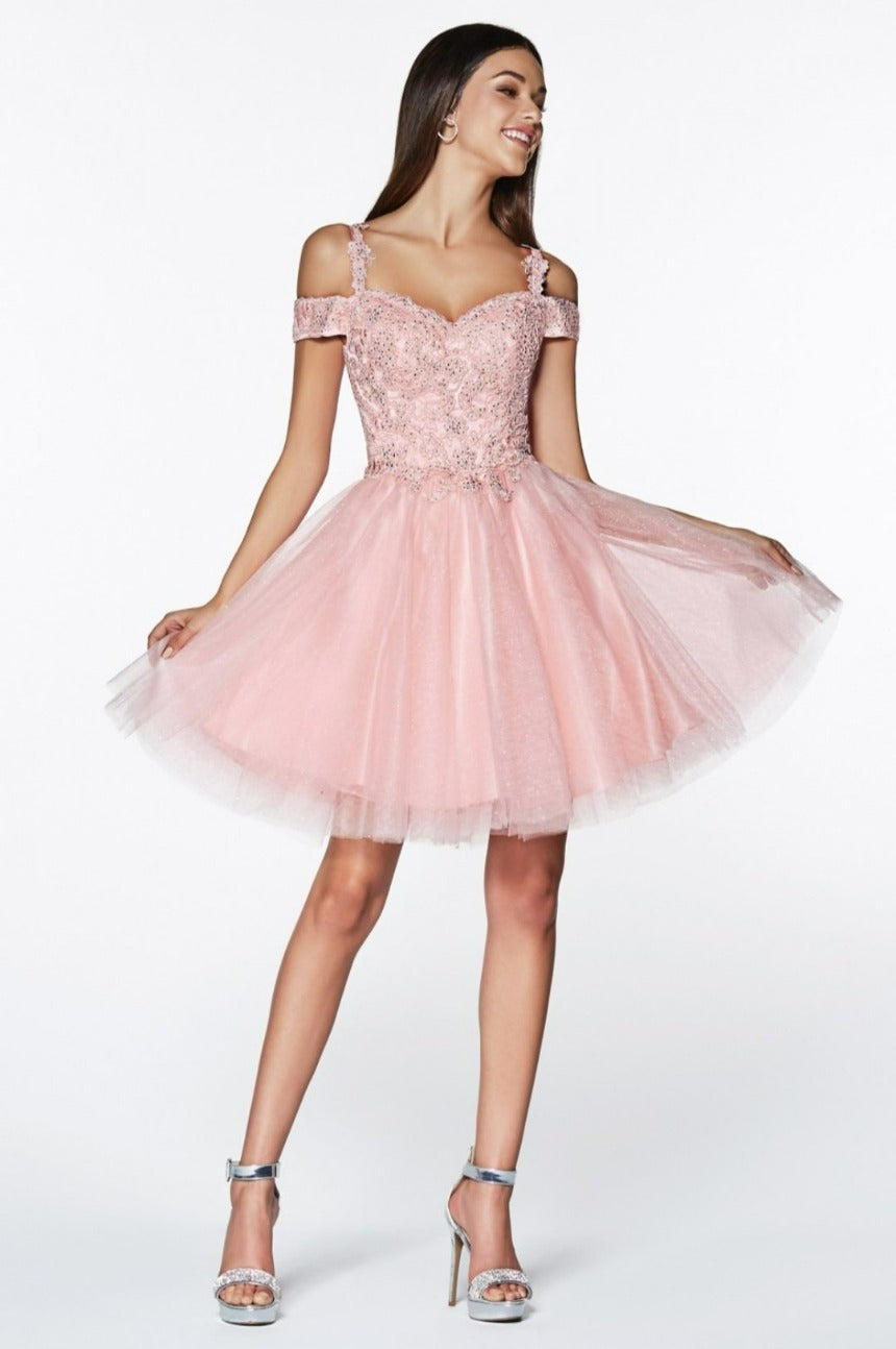 Make the night special in this beautiful short dress in which features a cold shoulder lace detail bodice and glitter tulle skirt. A great dress homecoming, or any special occasion!