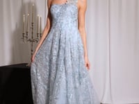 Graceful and refined, this A-line gown is designed for women who want elegance with timeless charm. The one-shoulder neckline features delicate three-dimensional floral appliqué, offering a soft sculptural detail that feels feminine without being overstated. Intricate beading and lace embroidery cascade throughout the bodice and skirt, giving the gown a subtle, luminous shimmer with every movement. The silhouette glides beautifully over the body. Perfect for feeling confident and polished throughout the celebration.