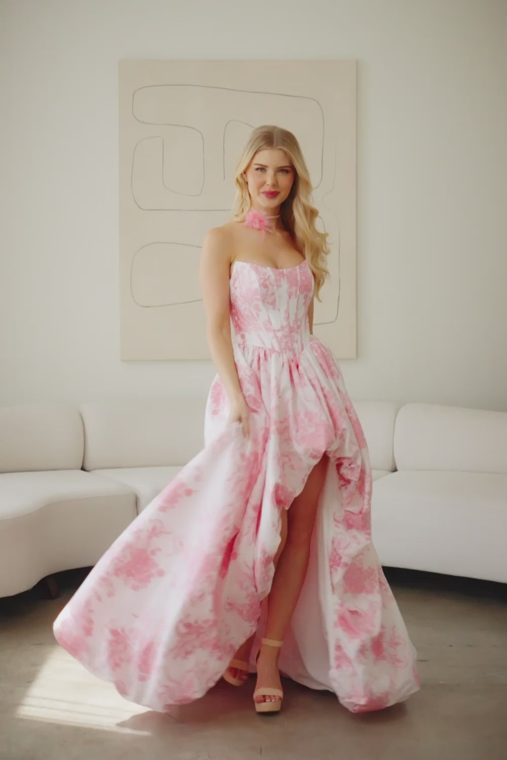 This romantic Jacquard floral A-line gown brings garden-party elegance to life with its high-low bubble skirt that flows away from the body in a flattering A-line silhouette and features side pockets. Featuring a strapless boat neckline and structured sheer mesh corset bodice, the dress is designed to flatter while offering comfortable movement. Complete with a 3D neckband and lace-up back, this piece is ideal for spring celebrations, bridal showers, or editorial moments.