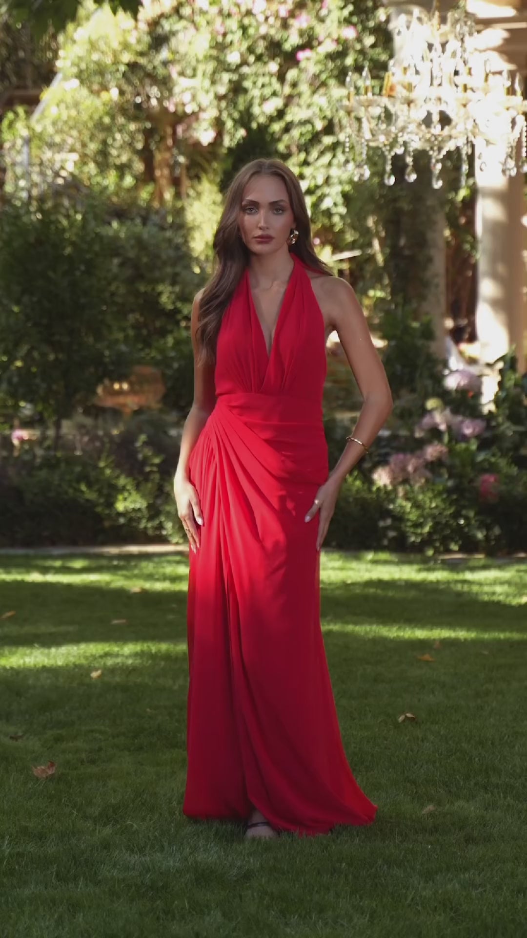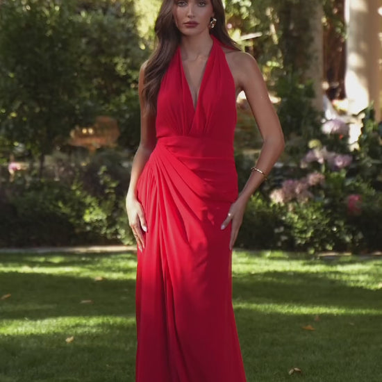Elegant and effortlessly flattering, this halter chiffon gown features a plunging neckline with softly gathered draping along the waist and hips. The floor-length skirt flows beautifully with every step, while a side slit adds a touch of modern edge. Finished with a self-tie bow at the neck and a sleek open back, this dress is perfect for weddings, proms, or sunset soirées.